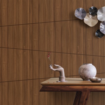 Refined light Solano teak laminate showcasing warm caramel undertones with distinctive linear grain articulation and subtle natural luster. Delivers tropical sophistication with contemporary restraint, perfect for modern residential applications requiring authentic exotic timber character with refined architectural elegance.