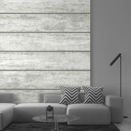 Light grey travertine laminate with subtle horizontal banding offers refined natural stone aesthetics. Ideal for modern minimalist and contemporary interior designs.